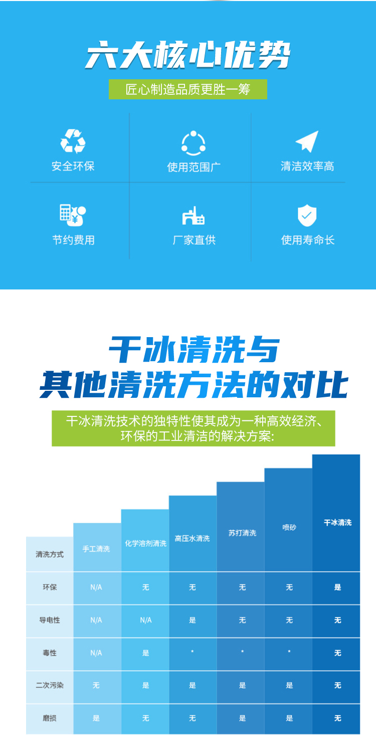 干冰粒在接觸時會升華(蒸發(fā)),清洗過程中沒有產(chǎn)生化學(xué)物質(zhì)、無毒、非磨料、非易燃、非導(dǎo)電;消除化學(xué)清潔的成本和危害,避免昂貴的環(huán)境清潔要求。