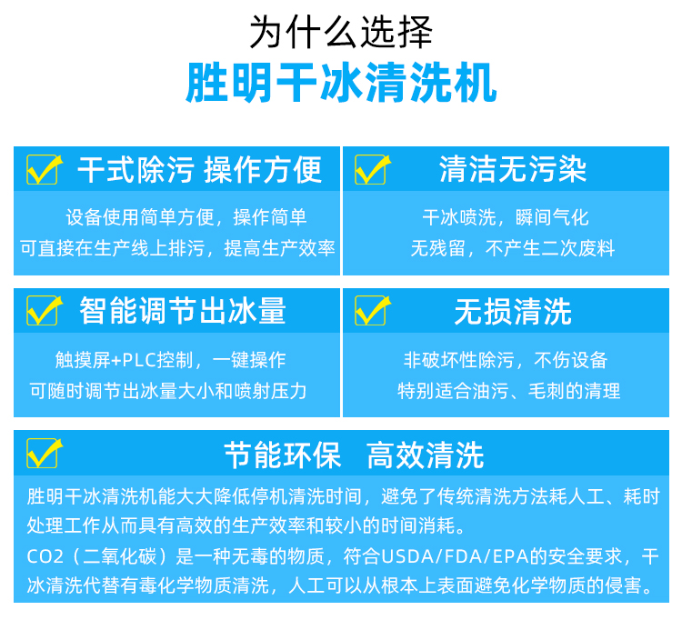 干冰粒在接觸時會升華(蒸發),清洗過程中沒有產生化學物質、無毒、非磨料、非易燃、非導電;消除化學清潔的成本和危害,避免昂貴的環境清潔要求。