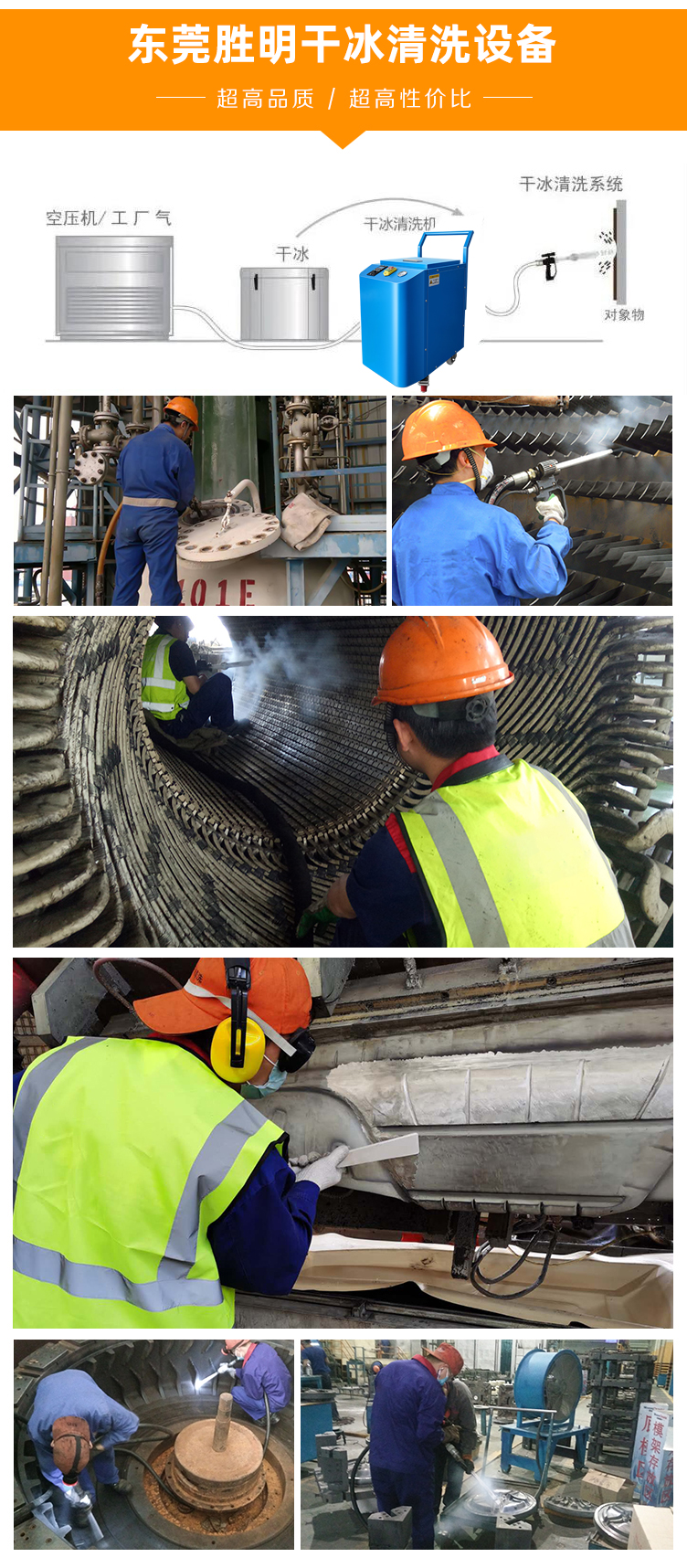 二氧化碳在-78.5°時凝固成固體,即干冰,干冰粉碎后分散在高壓空氣中,然后通過高速噴嘴加速后沖擊到被清潔的表面。高壓氣浪,再加上其中的干冰顆粒吹掃模具表面的殘留物。高聚物在低溫時變脆,并且變冷收縮,和模具分離。干冰顆粒在撞擊時升華,由固體變成氣體,膨脹了數(shù)百倍,進(jìn)一步產(chǎn)生了沖擊力,從而達(dá)到快速、高效的清洗效果。
